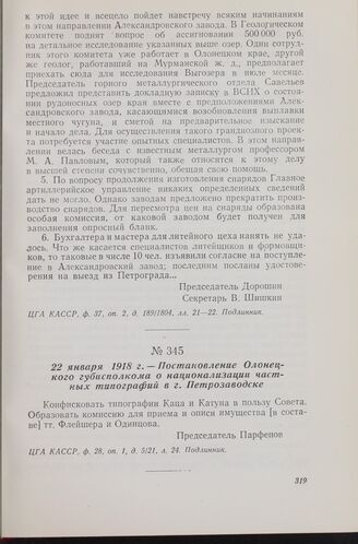 22 января 1918 г. — Постановление Олонецкого губисполкома о национализации частных типографий в г. Петрозаводске // ЦГА КАССР, ф. 28, оп. 1, д. 5/21, л. 24. Подлинник.