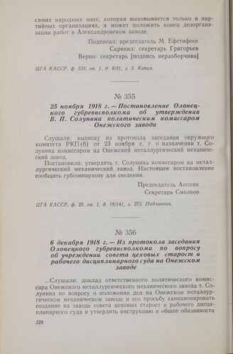 25 ноября 1918 г. — Постановление Олонецкого губревисполкома об утверждении В. П. Солунина политическим комиссаром Онежского завода