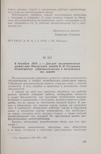 6 декабря 1918 г. — Доклад политического комиссара Онежского завода В. П. Солунина Олонецкому губревисполкому о положении на заводе // ЦГА КАССР, ф. 28, оп. 1, д. 4/19, л. 410. Подлинник.