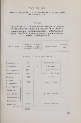29 мая 1918 г. — Сведения Олонецкого губернского лесного отдела о количестве лесных материалов, заготовленных хозяйственным способом и намеченных к транспортировке в Петроград