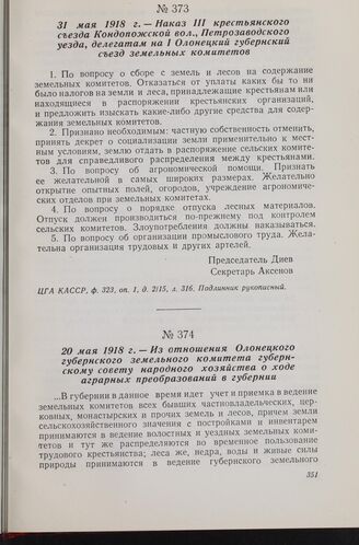 20 мая 1918 г. — Из отношения Олонецкого губернского земельного комитета губернскому совету народного хозяйства о ходе аграрных преобразований в губернии // ЦГА КАССР, ф. 108, оп. 1, д. 6/62, лл. 81—82. Отпуск.