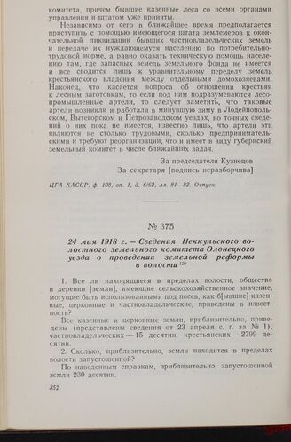 24 мая 1918 г. — Сведения Неккульского волостного земельного комитета Олонецкого уезда о проведении земельной реформы в волости // ЦГА КАССР, ф. 437, оп. 1, д. 36/493, л. 35. Подлинник рукописный.