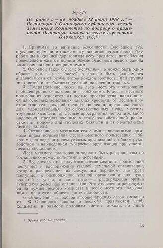 Не ранее 5 — не позднее 12 июня 1918 г. — Резолюция I Олонецкого губернского съезда земельных комитетов по вопросу о применении Основного закона о лесах в условиях Олонецкой губ.