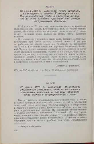 26 июля 1918 г. — Приговор схода крестьян с. Кончезерского завода, Кончезерской вол., Петрозаводского уезда, о наделении их землей за счет излишка крестьянских земель окружающих деревень