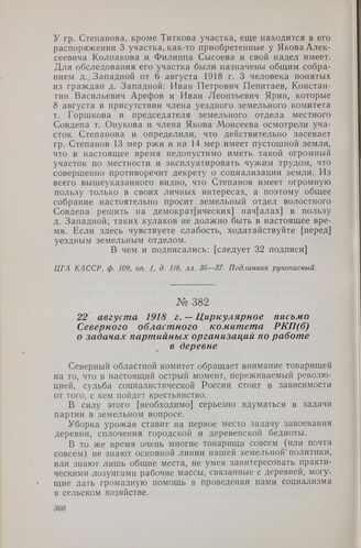 22 августа 1918 г. — Циркулярное письмо Северного областного комитета РКП(б) о задачах партийных организаций по работе в деревне