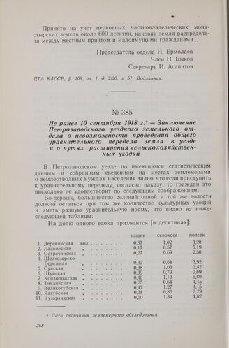 Не ранее 10 сентября 1918 г. — Заключение Петрозаводского уездного земельного отдела о невозможности проведения общего уравнительного передела земли в уезде и о путях расширения сельскохозяйственных угодий