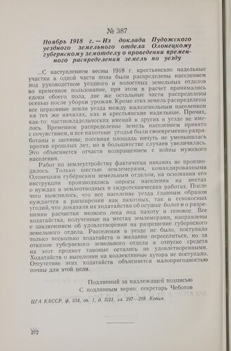 Ноябрь 1918 г. — Из доклада Пудожского уездного земельного отдела Олонецкому губернскому земотделу о проведении временного распределения земель по уезду // ЦГА КАССР, ф. 334, оп. 1, д. 3/21, лл. 297—298. Копия.