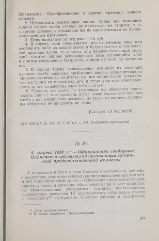5 марта 1918 г. — Официальное сообщение Олонецкого губсовета об организации губернской продовольственной коллегии // «Известия Олонецкого губсовета» № 26, 5 марта 1918 г.