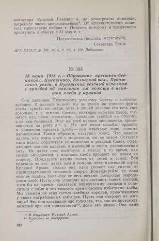 18 июня 1918 г. — Обращение крестьян-бедняков с. Киковского, Коловской вол., Пудожского уезда, в Пудожский уездный исполком с просбой об оказании им помощи в изъятии хлеба у кулаков