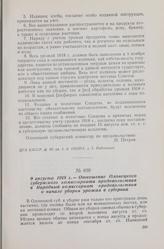 9 августа 1918 г. — Отношение Олонецкого губернского комиссариата продовольствия в Народный комиссариат продовольствия о начале уборка урожая в губернии // ЦГА КАССР, ф. 98, оп. 1, д. 104/2013, л. 27. Отпуск.