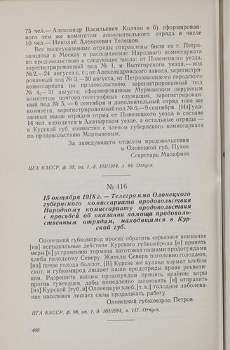 15 октября 1918 г. — Телеграмма Олонецкого губернского комиссариата продовольствия Народному комиссариату продовольствия с просьбой об оказании помощи продовольственным отрядам, находящимся в Курской губ.
