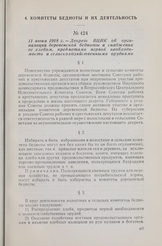 11 июня 1918 г. — Декрет ВЦИК об организации деревенской бедноты и снабжении ее хлебом, предметами первой необходимости и сельскохозяйственными орудиями // Собрание узаконений и распоряжений рабочего и крестьянского правительства, 1918 г., № 43, ст. 524.