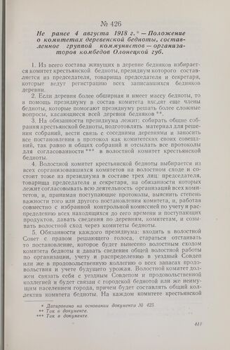 Не ранее 4 августа 1918 г. — Положение о комитетах деревенской бедноты, составленное группой коммунистов — организаторов комбедов Олонецкой губ. // ПА КФ ИМЛ, ф. 14, оп. 2, д. 23, л. 42. Воспроизведено типографским способом. Опубликовано в сборнике документов «Комитеты бедноты Северной области». Л., 1947, стр. 58—59.