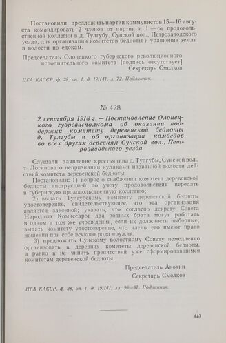 2 сентября 1918 г. — Постановление Олонецкого губревисполкома об оказании поддержки комитету деревенской бедноты д. Тулгубы и об организации комбедов во всех других деревнях Сунской вол., Петрозаводского уезда // ЦГА КАССР, ф. 28, оп. 1, д. 19/141, лл. 96—97. Подлинник.