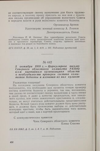 3 октября 1918 г. — Циркулярное письмо Северного областного комитета РКП(б) всем партийным организациям области о необходимости проверки состава комитетов бедноты и изгнания из них кулаков // ПА КФ ИМЛ, ф. 2, оп. 1. д. 7, л. 16. Подлинник.