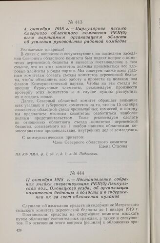 11 октября 1918 г. — Постановление собрания ячейки сочувствующих РКП(б) Неккульской вол., Олонецкого уезда, об организации комитетов бедноты в волости и о содержании их за счет обложения кулаков // ПА КФ ИМЛ, ф. 13, оп. 1, д. 9, лл. 5—6. Копия рукописная незаверенная.
