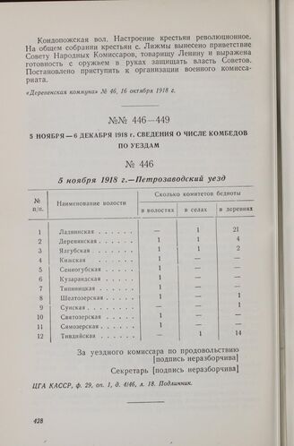 5 ноября 1918 г. — Сведения о числе комбедов по уездам. Петрозаводский уезд // ЦГА КАССР, ф. 29, оп. 1, д. 4/46, л. 18. Подлинник.