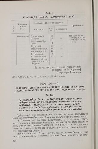 6 декабря 1918 г. — Сведения о числе комбедов по уездам. Повенецкий уезд