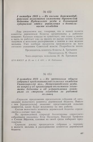 2 октября 1918 г. — Из протокола общего собрания представителей сельских комбедов Святозерской вол., Петрозаводского уезда, по вопросу об организации волостного комитета бедноты и об установлении контроля со стороны комбедов за работой мельниц
