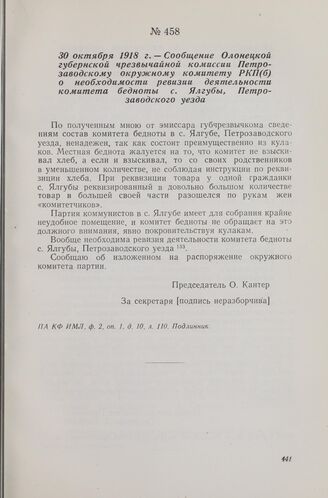 30 октября 1918 г. — Сообщение Олонецкой губернской чрезвычайной комиссии Петрозаводскому окружному комитету РКП(б) о необходимости ревизии деятельности комитета бедноты с. Ялгубы, Петрозаводского уезда // ПА КФ ИМЛ, ф. 2, оп. 1, д. 10, л. 110. Подлинник.