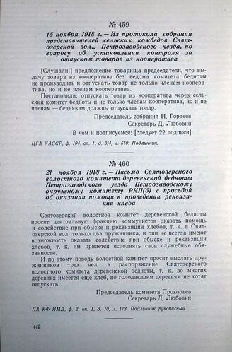 21 ноября 1918 г. — Письмо Святозерского волостного комитета деревенской бедноты Петрозаводского уезда Петрозаводскому окружному комитету РКП(б) с просьбой об оказании помощи в проведении реквизиции хлеба // ПА КФ ИМЛ, ф. 2, оп. 1, д. 10, л. 173. Подлинник рукописный.