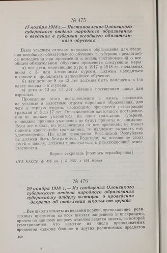 29 ноября 1918 г. — Из сообщения Олонецкого губернского отдела народного образования губернскому отделу юстиции о проведении декрета об отделении школы от церкви // ЦГА КАССР, ф. 2, оп. 1, д. 16/205, л. 46. Отпуск.