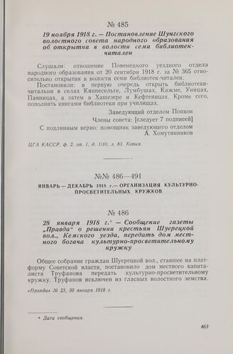 28 января 1918 г. — Сообщение газеты «Правда» о решении крестьян Шуерецкой вол., Кемского уезда, передать дом местного богача культурно-просветительному кружку