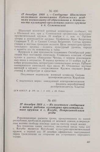 27 декабря 1918 г. — Из газетного сообщения о начале работы культурно-просветительного кружка в с. Ялгубе, Петрозаводского уезда