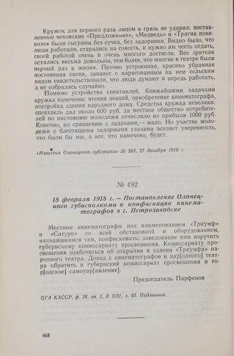 18 февраля 1918 г. — Постановление Олонецкого губисполкома о конфискации кинематографов в г. Петрозаводске