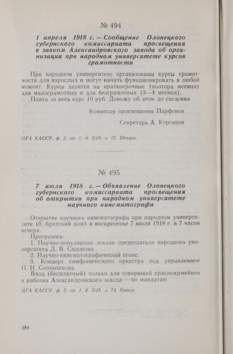 1 апреля 1918 г. — Сообщение Олонецкого губернского комиссариата просвещения в завком Александровского завода об организации при народном университете курсов грамотности // ЦГА КАССР, ф. 2, оп. 1, д. 2/19, л. 17. Отпуск.