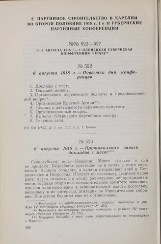 6 августа 1918 г. — I Олонецкая губернская конференция РКП(б). Протокольная запись докладов с мест // ПА КФ ИМЛ, ф. 4, оп. 1, д. 5, лл. 2—3, 7—8. Копия.