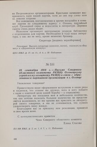 19 сентября 1918 г. — Письмо Северного областного комитета РКП(б) Олонецкому городскому комитету РКП(б) в связи с образованием партийной организации в г. Олонце