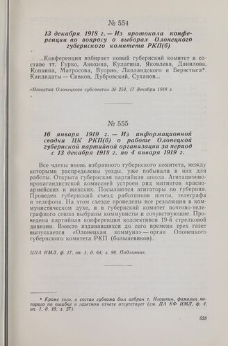 16 января 1919 г. — Из информационной сводки ЦК РКП(б) о работе Олонецкой губернской партийной организации за период с 13 декабря 1918 г. по 4 января 1919 г. // ЦПА ИМЛ, ф. 17, оп. 1, д. 64, л. 98. Подлинник.