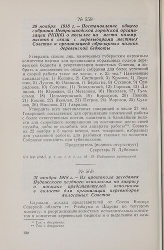 21 ноября 1918 г. — Из протокола заседания Пудожского уездного исполкома по вопросу о посылке представителей исполкома в волости для организации перевыборов волостных Советов // ЦГА КАССР, ф. 249, оп. 5, д. 1/3, л. 280. Подлинник.