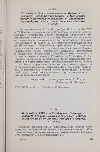 25 декабря 1918 г. — Отношение Пудожского уездного отдела управления в Олонецкий губернский отдел управления о завершении перевыборов сельских и волостных Советов в уезде // ЦГА КАССР, ф. 29, оп. 1, д. 5/64, л. 33. Подлинник.