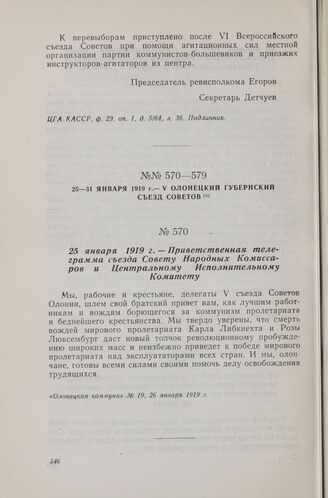 25 января 1919 г. — V Олонецкий губернский съезд Советов. Приветственная телеграмма съезда Совету Народных Комиссаров и Центральному Исполнительному Комитету
