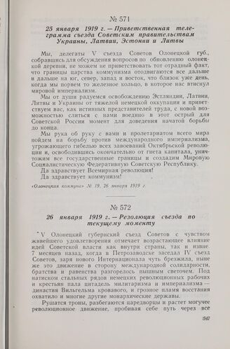 25 января 1919 г. — V Олонецкий губернский съезд Советов. Приветственная телеграмма съезда Советским правительствам Украины, Латвии, Эстонии и Литвы // «Олонецкая коммуна» № 19, 26 января 1919 г.