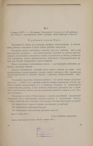 3 марта 1917 г. - Воззвание Орловского Совета р. д. «К рабочим гор. Орла» с изложением задач, стоящих перед рабочим классом // Газета «Орловский вестник», № 50, 4 марта 1917 г.