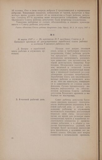 16 марта 1917 г. -Из протокола № 7 заседания Совета р. д. Брянского арсенала об урегулировании заработной платы рабочих и введении 8-часового рабочего дня // ГАБО, ф. 221, 1917 г., д. 76, лл. 11 об. -12. Копия.
