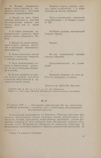 17 апреля 1917 г. - Телеграмма губкомиссара Вр. пр. ливенскому уездному комиссару о принятии мер к подавлению революционных выступлений крестьян