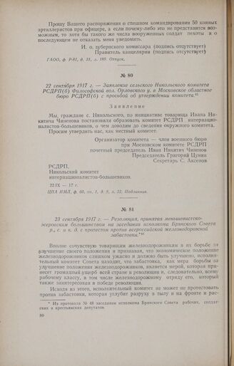 23 сентября 1917 г. - Резолюция, принятая меньшевистско-эсеровским большинством на заседании исполкома Брянского Совета р., с. и к. д. с протестом против всероссийской железнодорожной забастовки