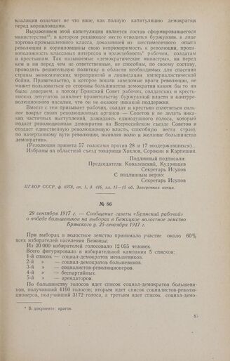 29 сентября 1917 г. - Сообщение газеты «Брянский рабочий» о победе большевиков на выборах в Бежицкое волостное земство Брянского у. 25 сентября 1917 г.