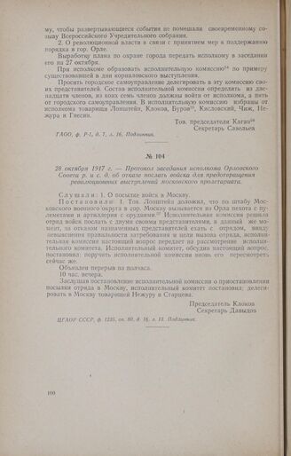 28 октября 1917 г. - Протокол заседания исполкома Орловского Совета р. и с. д. об отказе послать войска для предотвращения революционных выступлений московского пролетариата
