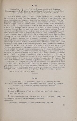 29 октября 1917 г. - Речь представителя думской фракции большевиков т. И. И. Фокина на заседании Брянской городской думы с требованием передать всю власть на местах Советам