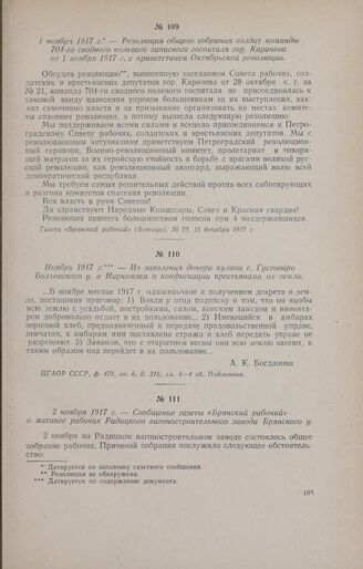1 ноября 1917 г. - Резолюция общего собрания солдат команды 704-го сводного полевого запасного госпиталя гор. Карачева от 1 ноября 1917 г. с приветствием Октябрьской революции