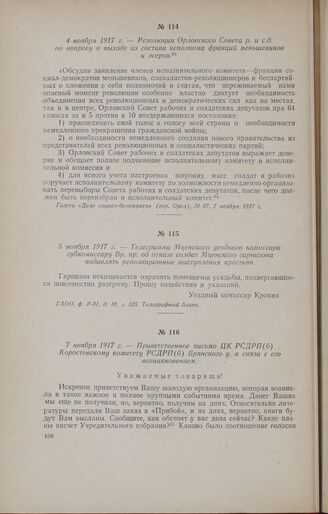 5 ноября 1917 г. - Телеграмма Мценского уездного комиссара губкомиссару Вр. пр. об отказе солдат Мценского гарнизона подавлять революционные выступления крестьян
