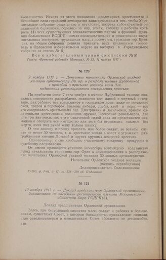 10 ноября 1917 г. - Доклад представителя Орловской организации большевиков на заседании расширенного пленума Московского областного бюро РСДРП(б) // ЦПА ИМЛ, ф. 60, оп. 3, д. 4, лл. 125-126. Копия.