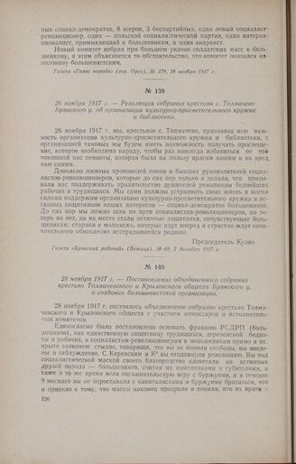 26 ноября 1917 г. - Резолюция собрания крестьян с. Толмачево Брянского у. об организации культурно-просветительного кружка и библиотеки // Газета «Брянский рабочий» (Бежица), № 68, 2 декабря 1917 г.