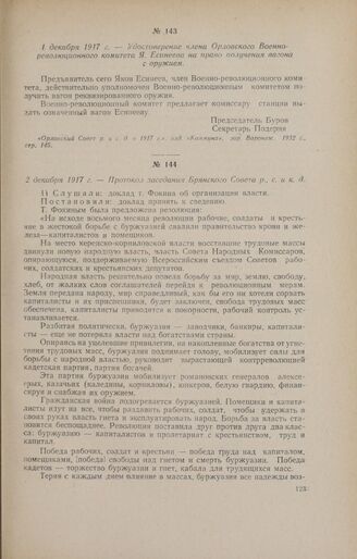 1 декабря 1917 г. - Удостоверение члена Орловского Военно-революционного комитета Я. Есинеева на право получения вагона с оружием // «Орловский Совет р. и с. д. в 1917 г.», изд. «Коммуна», гор. Воронеж, 1932 г., стр. 145.