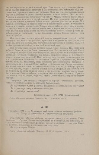6 декабря 1917 г. - Резолюция собрания рабочих табачных фабрик гор. Ельца об отношении к Учредительному собранию // Газета «Брянский рабочий» (Бежица), № 80, 17 декабря 1917 г.